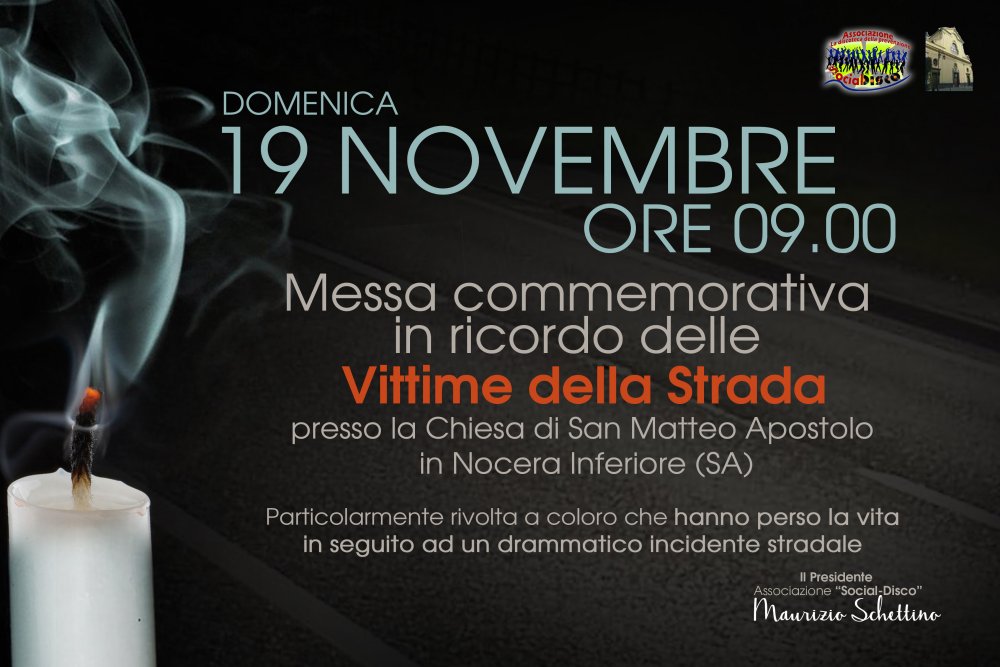 In occasione della Giornata Mondiale del Ricordo delle Vittime della Strada, anche quest'anno l'Associazione, da me presieduta, partecipa con un momento particolare di raccoglimento, previsto per Domenica prossima, 19 Novembre, alle ore 9,00, presso la Chiesa di San Matteo Apostolo in Nocera Inferiore (Sa)  |