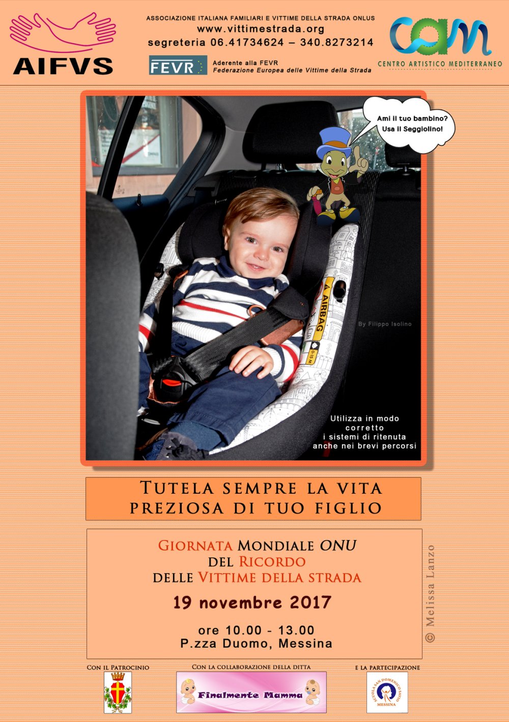 Sede AIFVS Messina resp. Giuseppa CassanitiGiornata mondiale del ricordo delle vittime della strada, 19 novembre 2017 11 novembre – Convegno “Non più fiori sull’asfalto – Dal Sacrificio, la Vita” presso il Salone degli Specchi della Provincia . Hanno partecipato rappresentanze degli alunni dei Licei di Messina per essere a loro volta impegnati a trasmettere alle classi di appartenenza l’esperienza di partecipazione sui temi trattati: gli interventi delle istituzioni per migliorare le condizioni di sicurezza delle infrastrutture nel territorio; l’incidentalità a Messina e l’opera della polizia urbana; il messaggio del manifesto per la prevenzione, l’esperienza del dolore trasformata in un impegno di miglioramento sociale; storie di salute e di vite distrutte; l’attività della CRI per la prevenzione e il soccorso alle vittime; i centri trasfusionali e la donazione di sangue; la donazione degli organi. 18 novembre – iniziative a Pazza Duomo, come da locandina, flash mob e diffusione di volantini 19 novembre – partecipazione alla S. Messa delle ore 11 presso la Basilica Cattedrale del Duomo con la preghiera per le vittime nell’ambito della preghiera dei fedeli, invito delle istituzioni cittadine e diffusione di volantini.  |