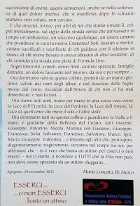 Esserci o non esserci…Basta un attimo”: è questo lo slogan che ha accompagnato l’edizione 2022 della Giornata mondiale in memoria delle vittime della strada ad Agrigento. Un’edizione diversa, certamente da ricordare, perché focalizza più che mai l’attenzione sulle criticità del territorio, sulle pessime condizioni di molte strade che spesso sono la causa principale, oltre all’imprudenza, di incidenti che spezzano tante vite in pochi istanti e che fanno versare lacrime infinite a chi rimane. Un Monumento il quale fine non sara’ solo di Memoria ma anche pedagogico, presso il quale le scolaresche agrigentine potranno recarsi per svolgere educazione civica¬-stradale e prendere piena coscienza del rispetto propria della VITA propria e degli altrie ad evitarne la sua fine a causa di una banale distrazione o da un uso scorretto di alcol o da altre sostanze nocive. Presenti all’inaugurazione del monumento la Presidente Nazionale dell’AIFVS APS Giuseppa Cassaniti, il prefetto Maria Rita Cocciufa, insieme al sindaco Francesco Micciche’  alle altre autorità civili e militari e a Graziella Viviano mamma di Elena Aubry, madrina del Monumento.